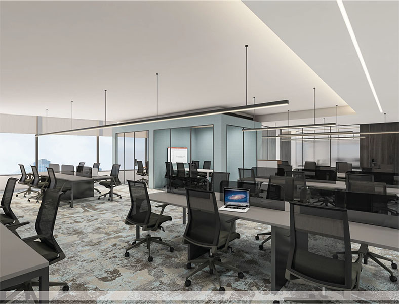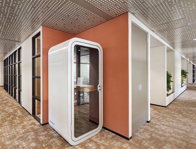 Soundproofing through double-glazed glass partitions & access to private phone booths.